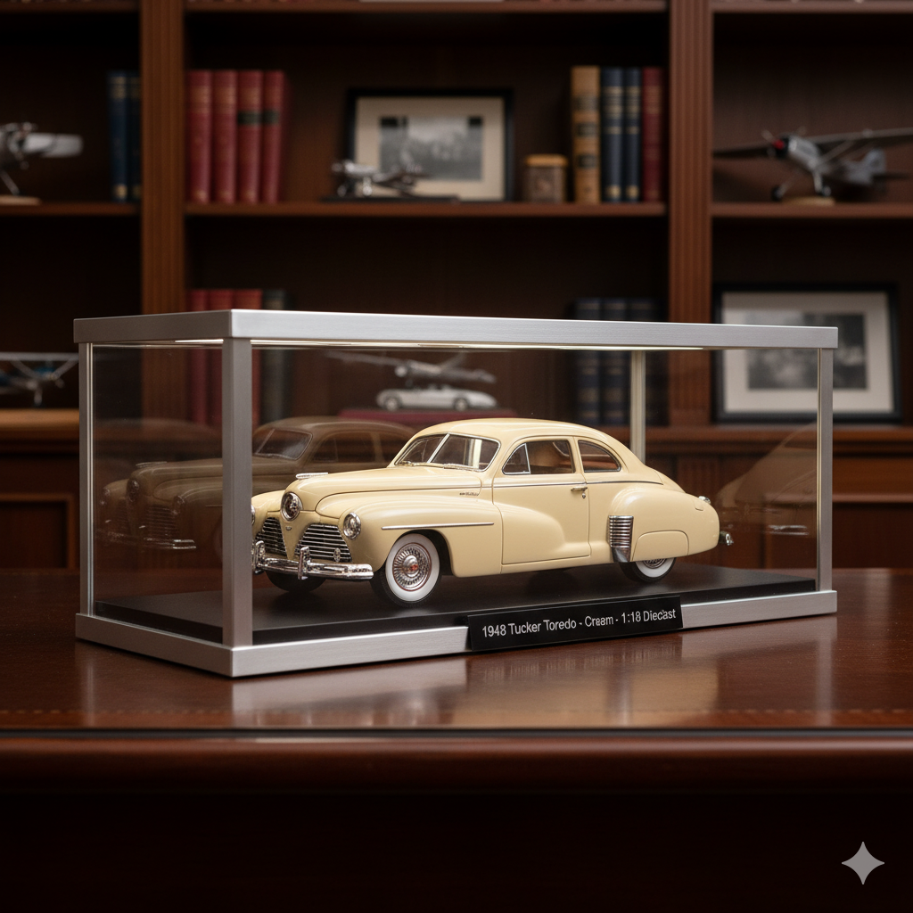 The 1948 Tucker Torpedo is legendary for its groundbreaking safety features, rear-mounted flat-six engine, and distinctive cyclops headlight, challenging conventional automotive design. This detailed model showcases its sleek, futuristic lines, unique styling cues, and the bold vision of Preston Tucker.