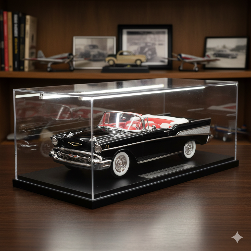 The 1957 Bel Air Convertible is celebrated for its distinctive tailfins, dazzling chrome, and powerful V8 engine options, embodying the optimism and flair of its era. This detailed model showcases its sleek lines, characteristic grille, and convertible top design.
