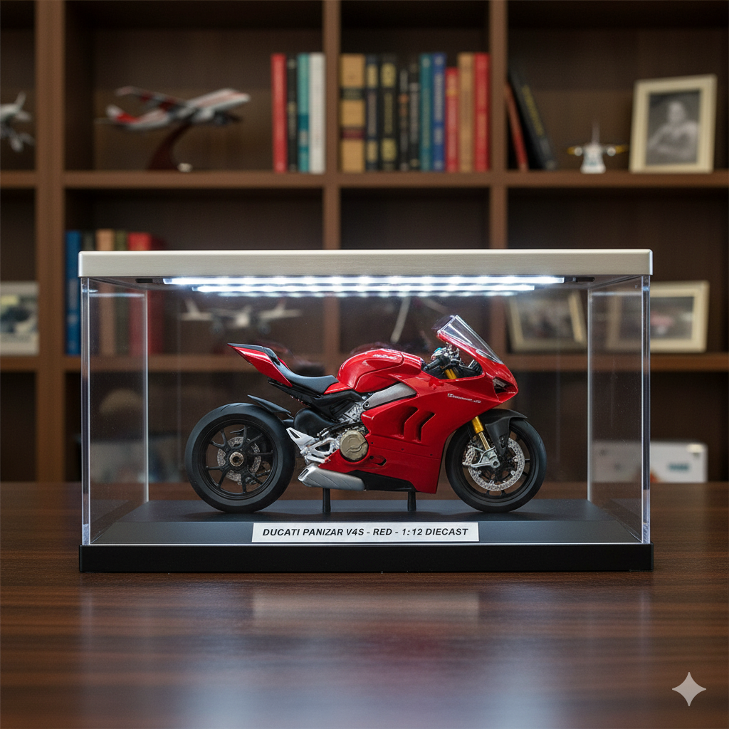 The Panigale V4S is celebrated for its powerful V4 engine, advanced electronics, and stunning design. This model showcases its aerodynamic lines, intricate engine details, and signature red finish.