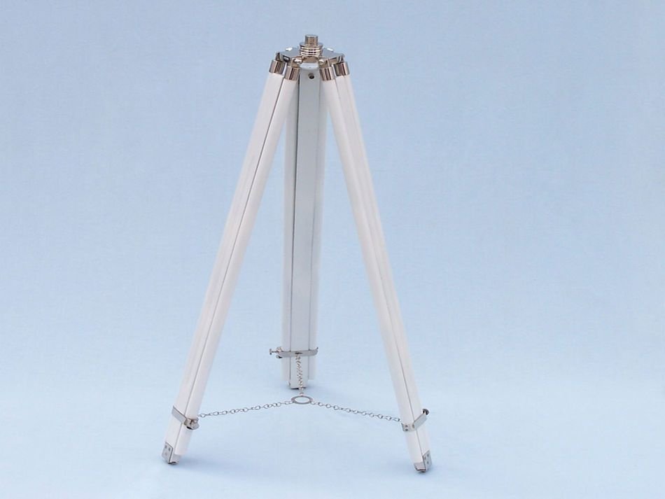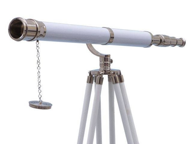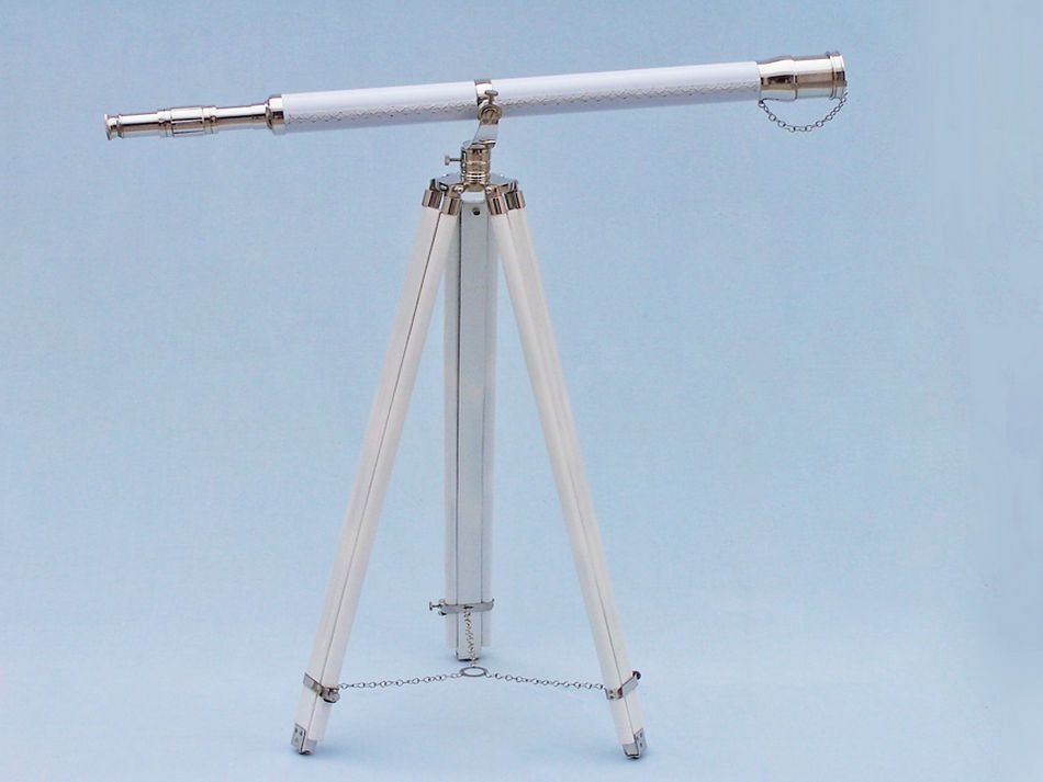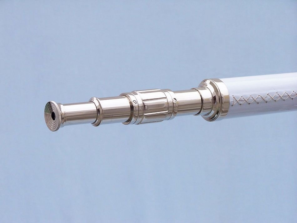 The Hampton Nautical Chrome/White Leather Galileo Telescope 65" is by far our standout choice amongst nautical enthusiasts worldwide. Constructed from 100% chrome, this refractor telescope is mounted on a wooden tripod. This telescope is a fully functioning nautical masterpiece that adds class and sophistication to any room it’s in. This is a perfect gift for the nautical explorer, an appropriate piece to spruce up an office for the busy executive, or perfectly position this exquisite telescope by your window sill to stargaze. The main scope is solid chrome wrapped in white leather, which shines beautifully when placed in the sunlight. Focusing is accomplished by adjusting the eyepiece ring on the telescope tube, with up to 15x magnification. A removable chrome cap, connected by a chain, protects the objective lens.