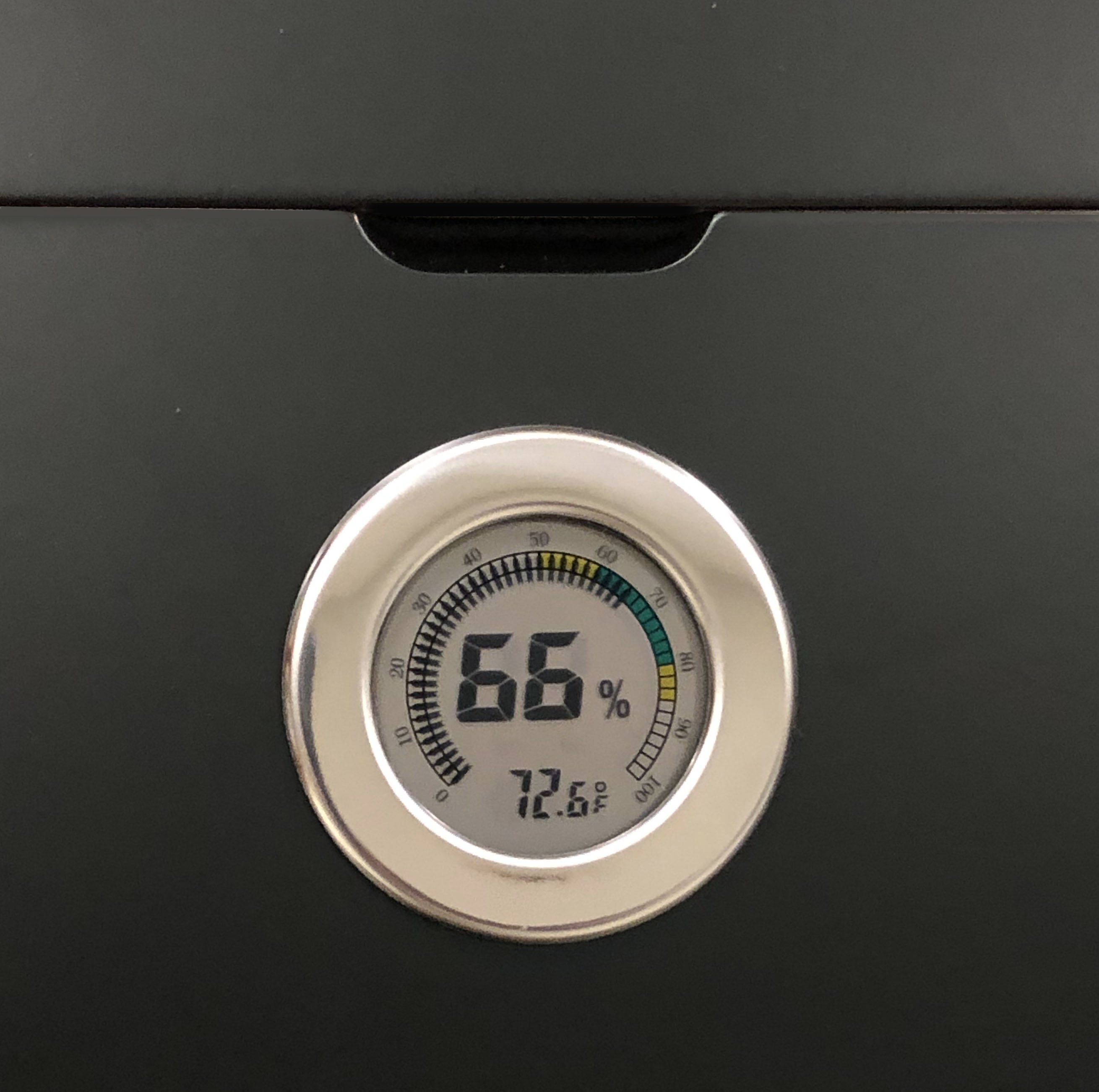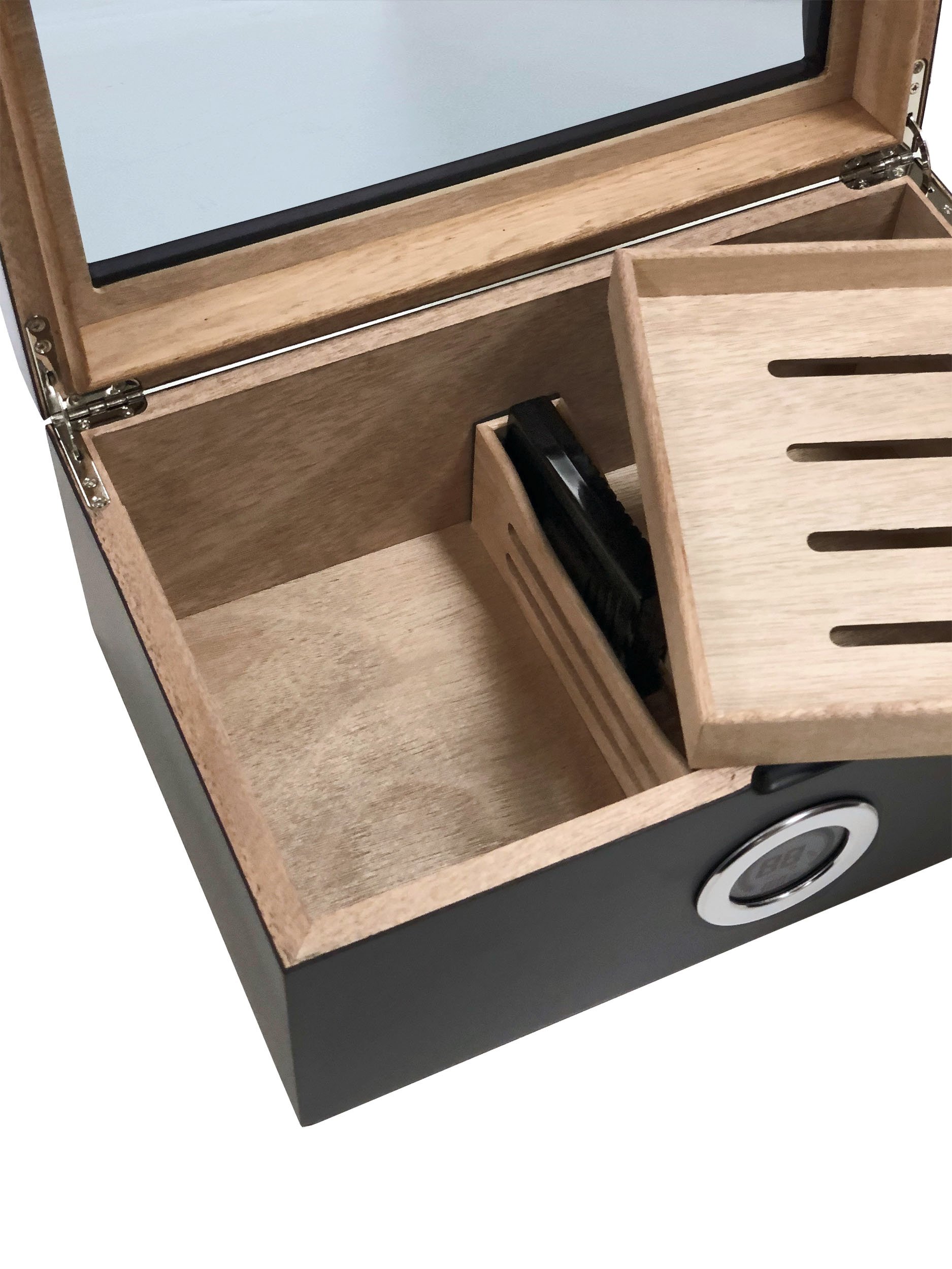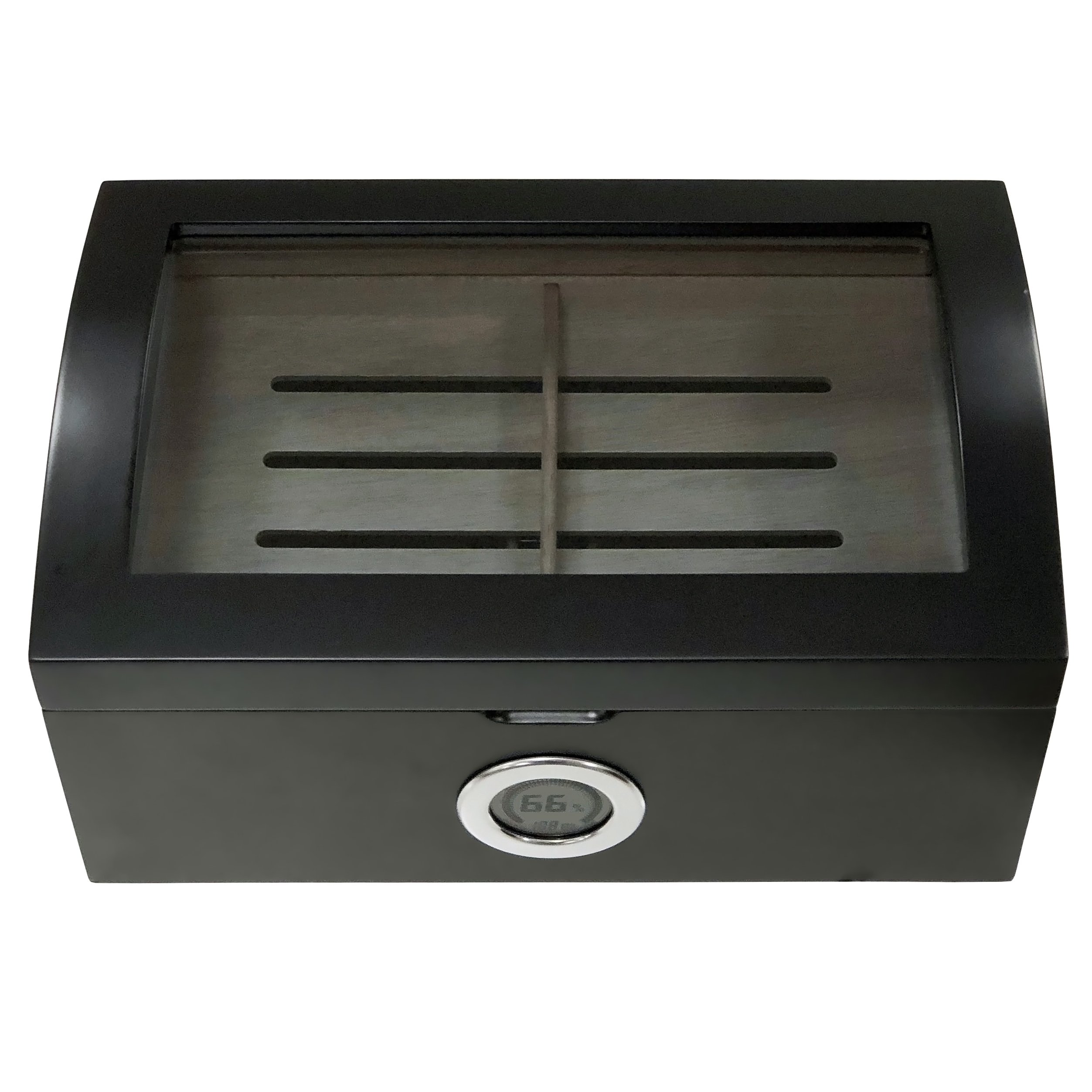 Modern design meets flawless cigar preservation. With its sleek matte black finish, darkened glass dome, and precision digital hygrometer, this humidor is as stylish as it is functional.