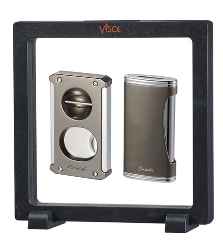 Gift this amazing duo for a special person this holiday! This gift set features a Caseti Trident 3-in-1 cigar cutter and the Caseti BigFlat cigar lighter in a visual display box set.