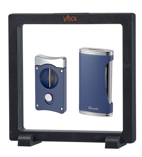 Gift this amazing duo for a special person this holiday! This gift set features a Wedge V cigar cutter and the Caseti BigFlat cigar lighter in a visual display box set.